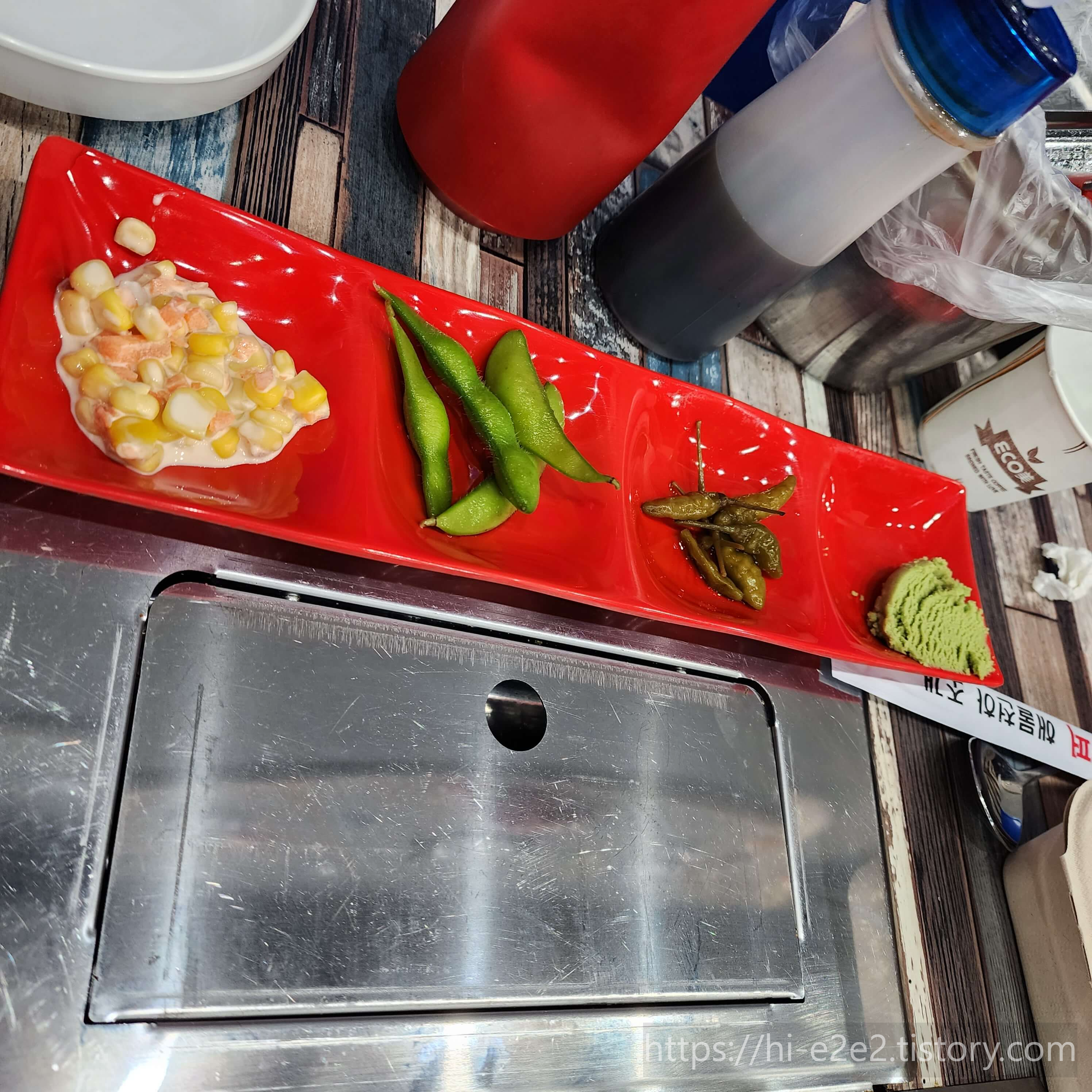 깔끔한 외관에 깔끔한 내부까지ㅎㅎ 해산물파는곳이라 파랑색으로 포인트를 준게 시원해보이더라구요~