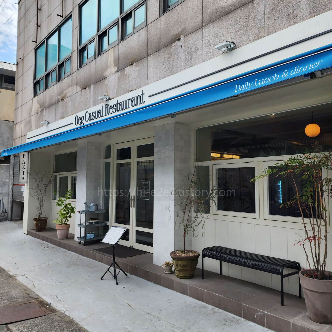 인스타 핫플답게 외관이 아주 깔끔하니 예뻤습니다ㅎㅎ 하얀 벽에 파란 천막만 있어도 그리스에 온 느낌~😎