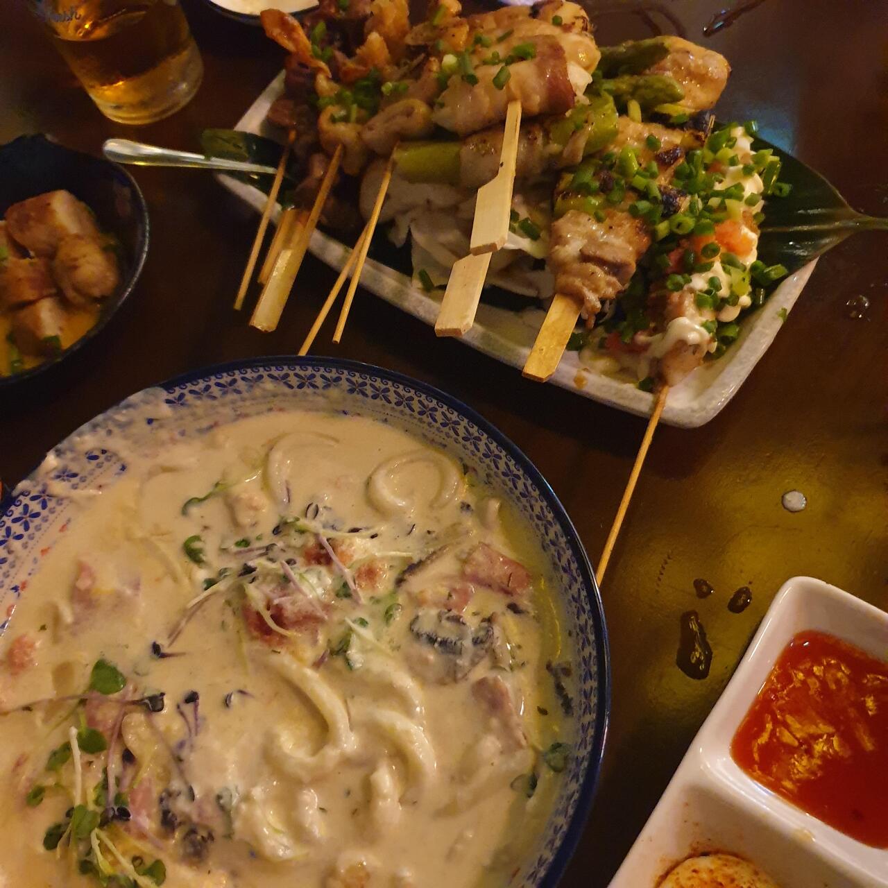 모둠꼬지를 주메뉴로 밀고있고 휘월에서 제일 유명한건 명란크림우동이라해서 모둠꼬지7종과 명란크림우동시킴🥰