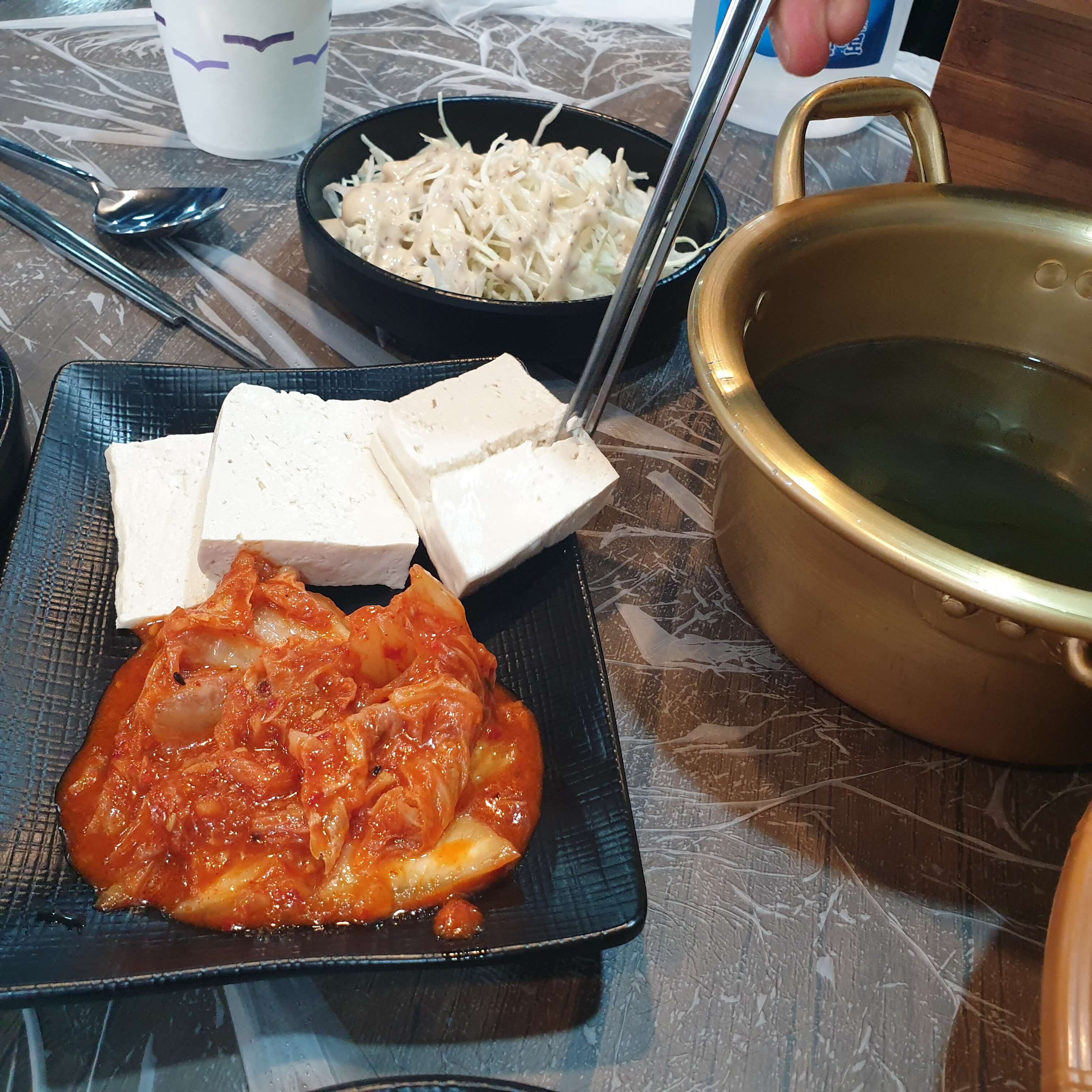 기본으로 오이무침, 콘샐러드, 양배추샐러드! 미역국과 두부김치까지 줍니다😊