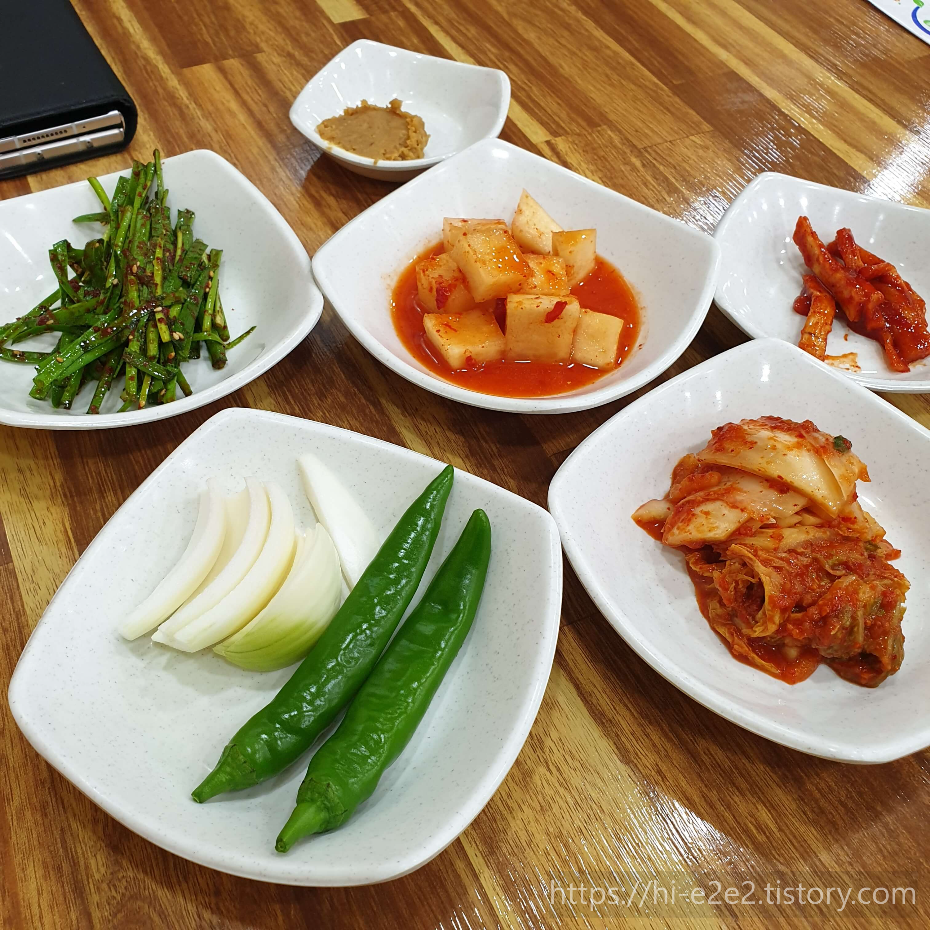 음식 주문 후 나온 밑반찬들😋 하나하나 다 맛봤는데 깍두기가 시원하니 정말 맛있더라고요!