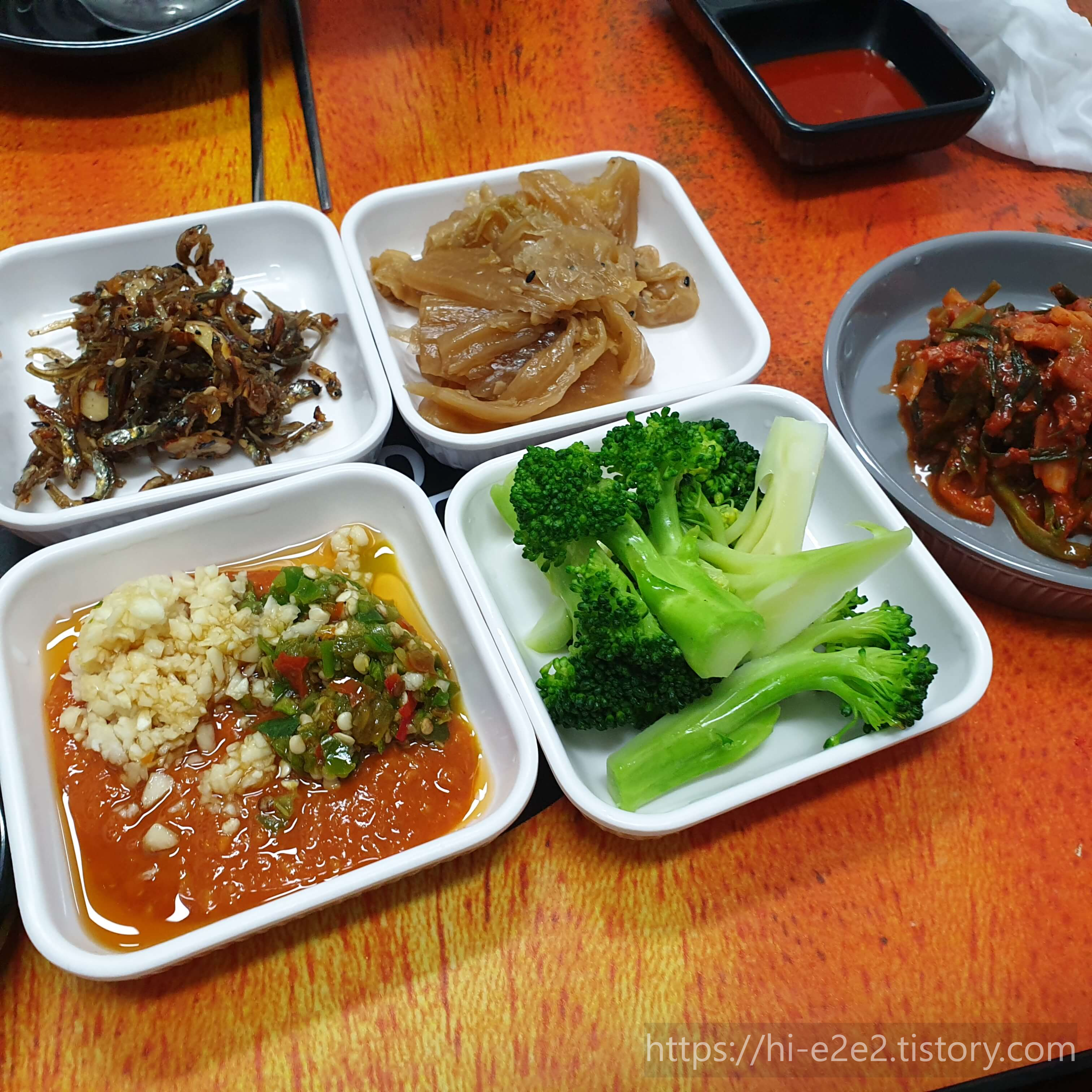 밑반찬으로는 멸치볶음, 씻은 묵은지, 쌈장, 브로콜리, 파김치를 주셨어요~