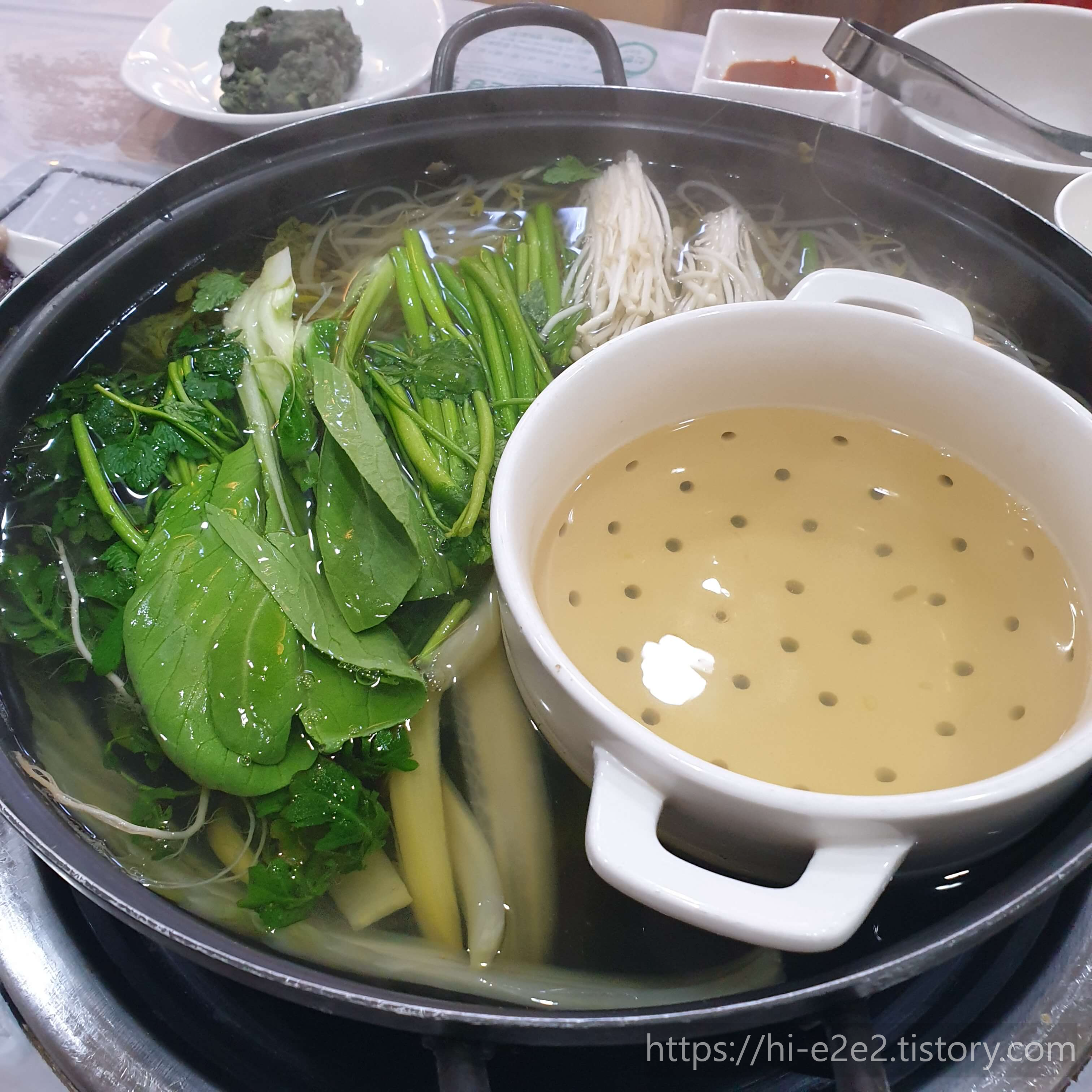 백경은 육수를 따로 우려서 내주시는데요~ 그래서 처음부터 바로 국물을 떠먹어도 야채의 시원한 맛이 느껴지더라고요 ㅎㅎ 오른쪽에 하얀 냄비에 새조개나 차돌박이를 담가서 먹으라고 하시더라고요~ 저 샤브용 냄비가 있으니 메인 음식과 야채가 뒤섞이지 않아 좋았답니다!