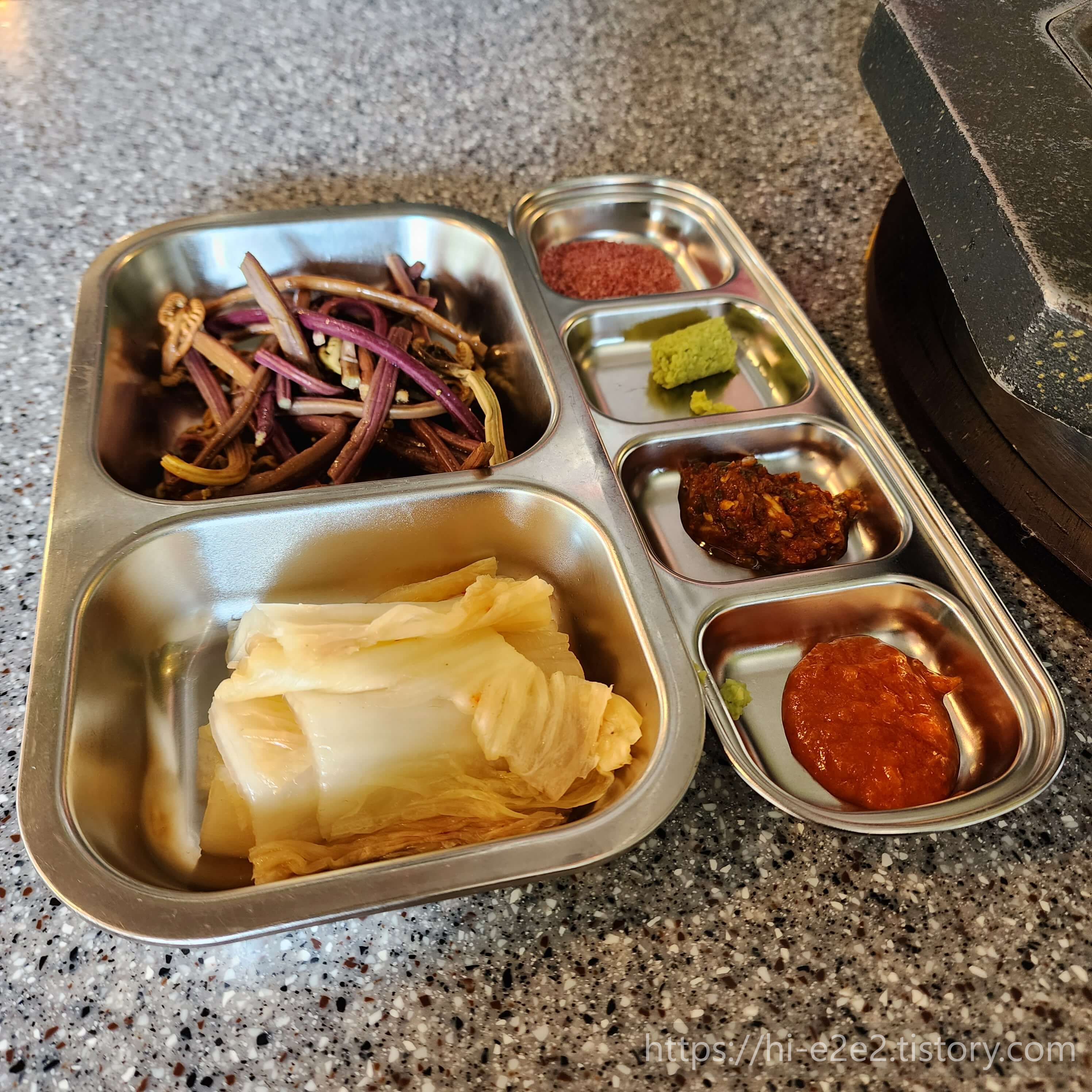 역시 제주고기는 고사리랑 같이 먹어야죠?ㅎㅎ 밑반찬으로 고사리와 백김치가 나오는데 다 구워주시더라고요~
