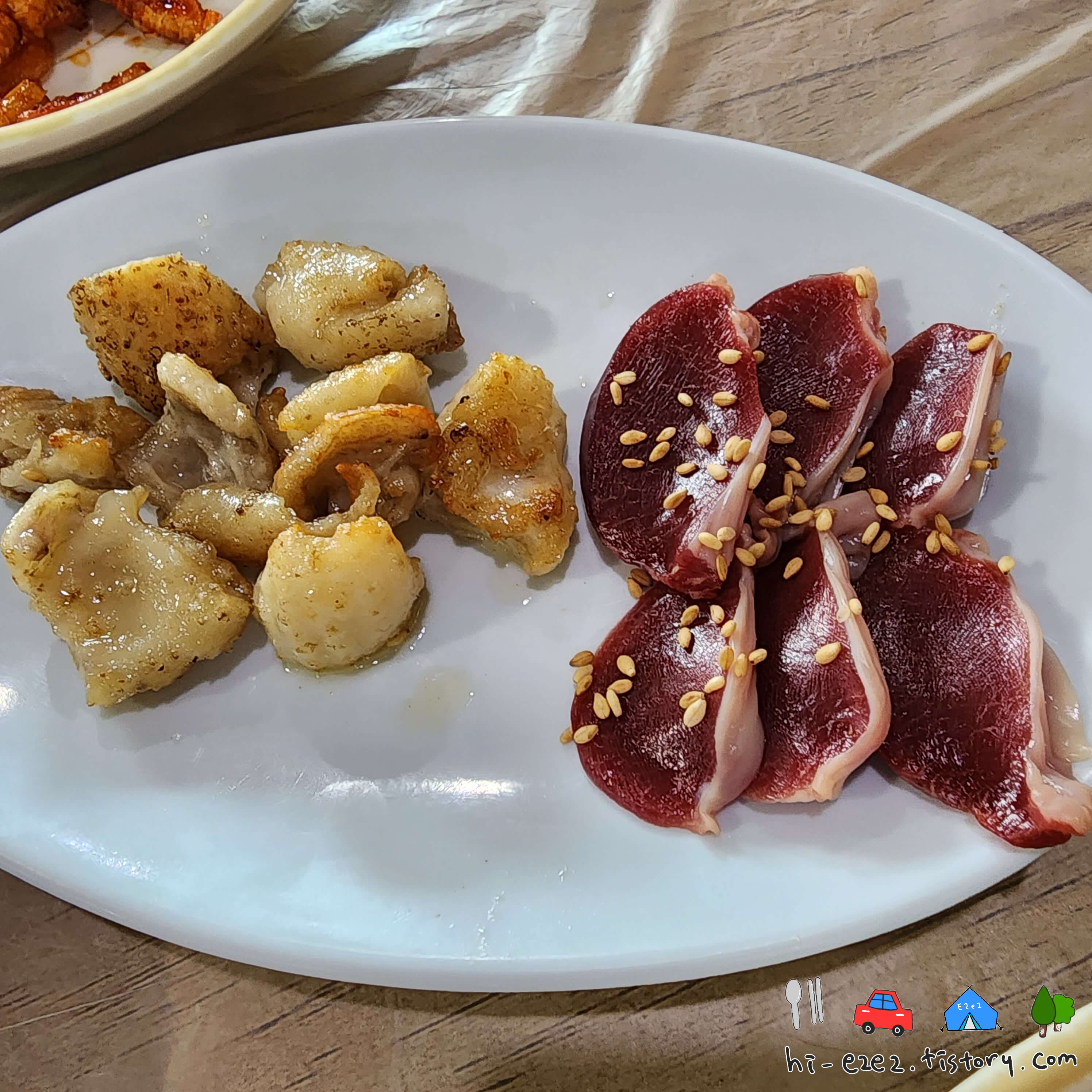 닭껍질구이와 모래집 회, 닭 육회가 같이 나온답니다ㅎㅎ