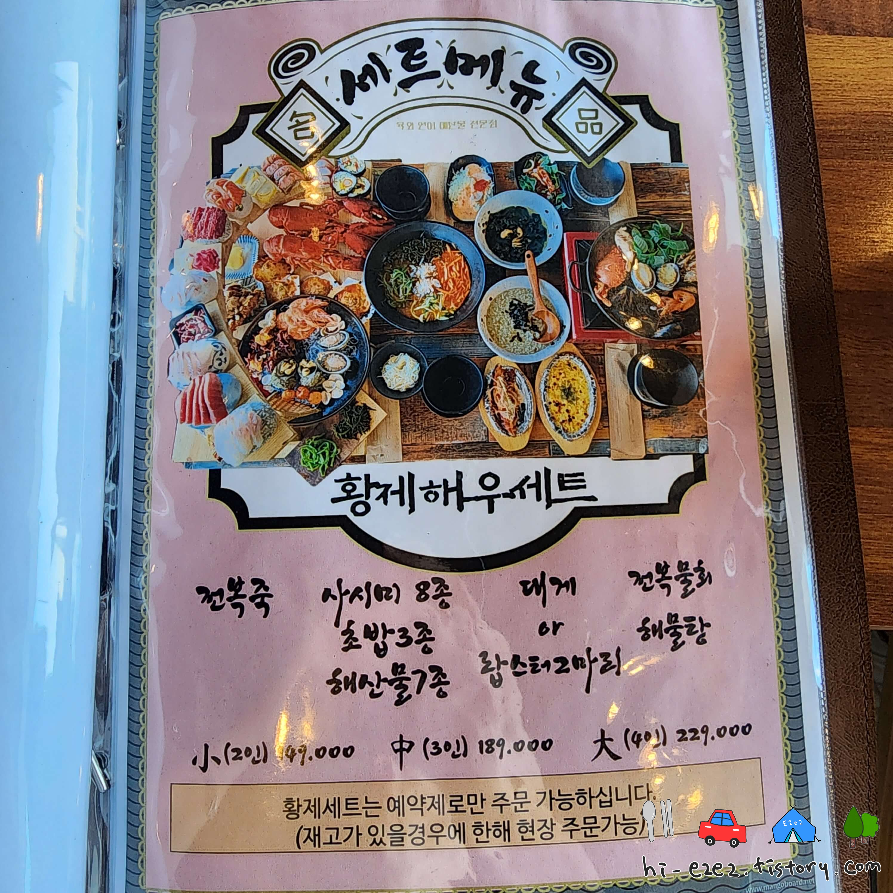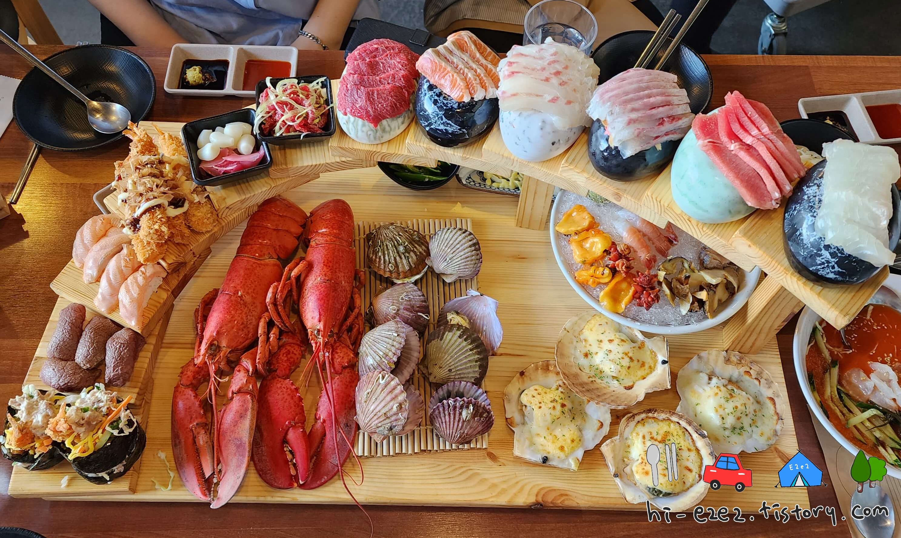 해우 황제세트는 회, 초밥, 해산물 그리고 랍스터 2마리가 셋팅되서 나옵니다.