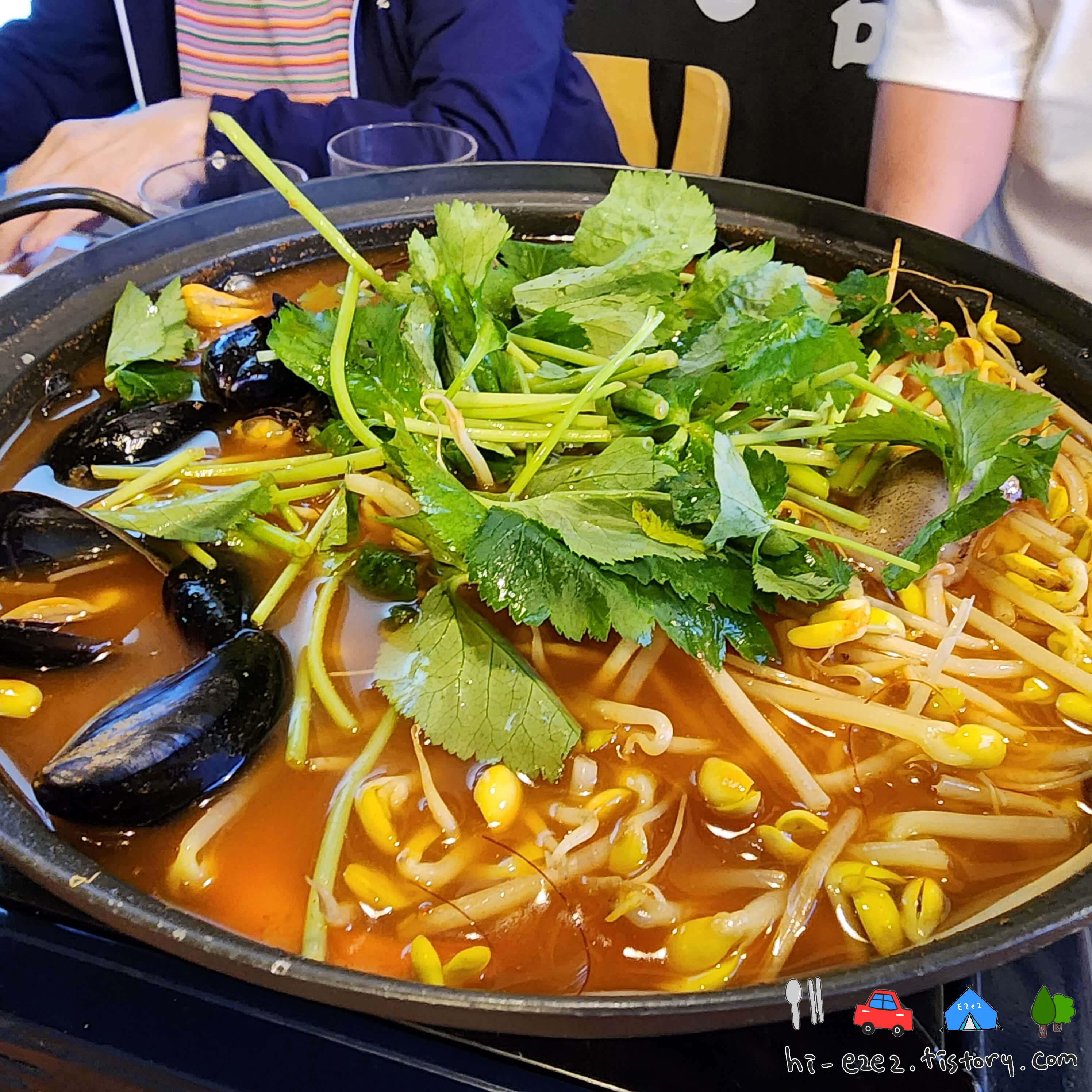 마지막으로 나온 해물탕~ 해물은 새우, 오징어, 홍합, 게 이렇게 들어있고 콩나물이 들어있어서 정말 시원하더라고요!
