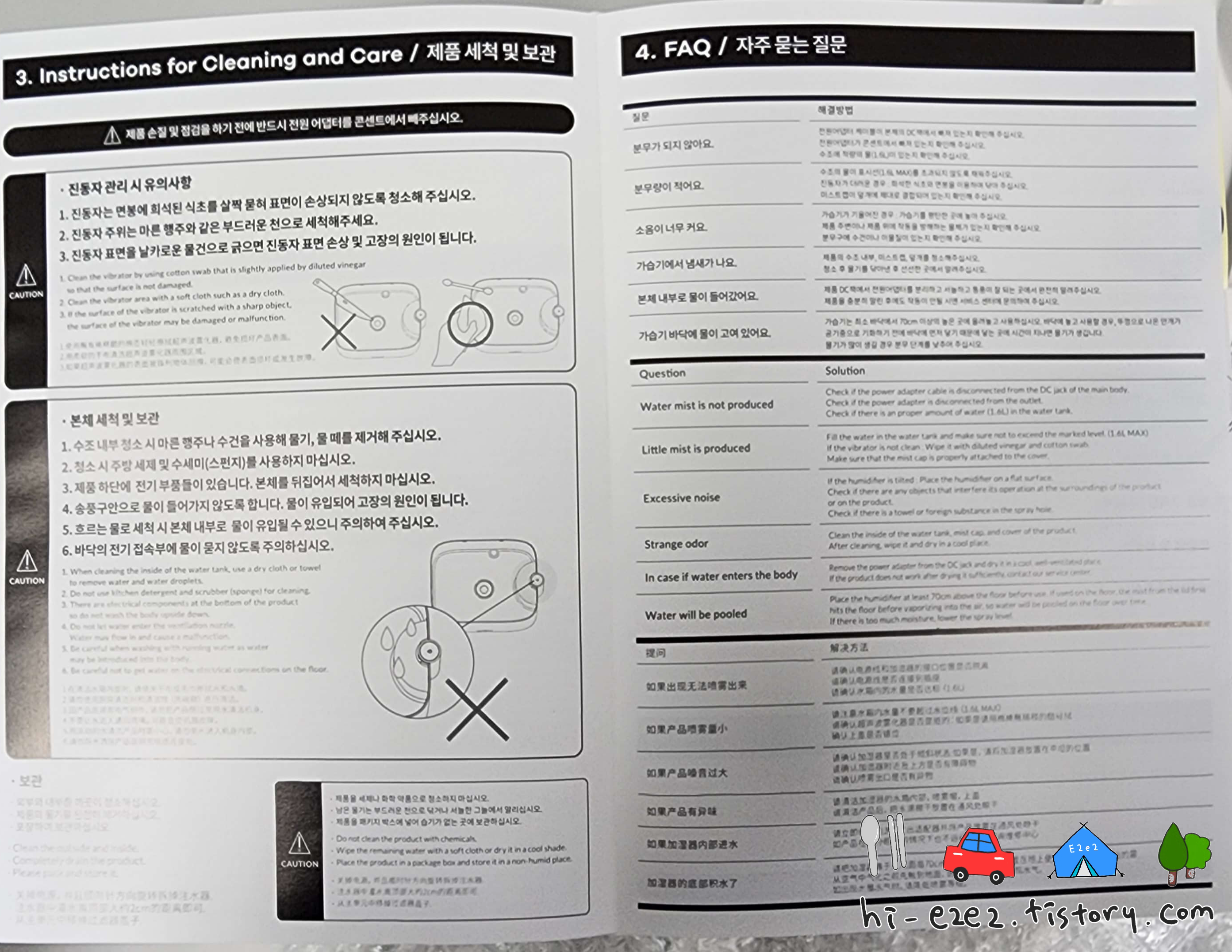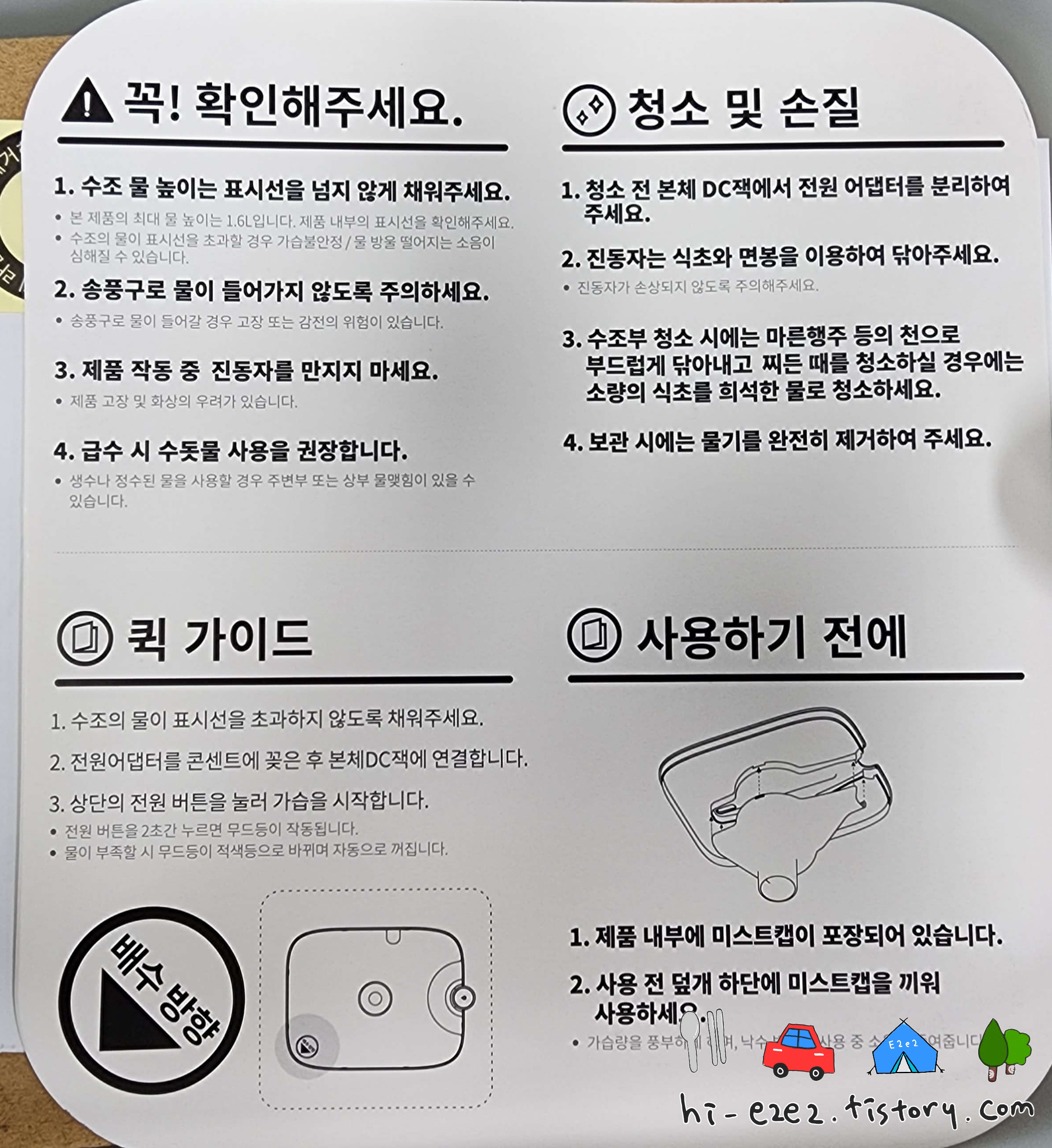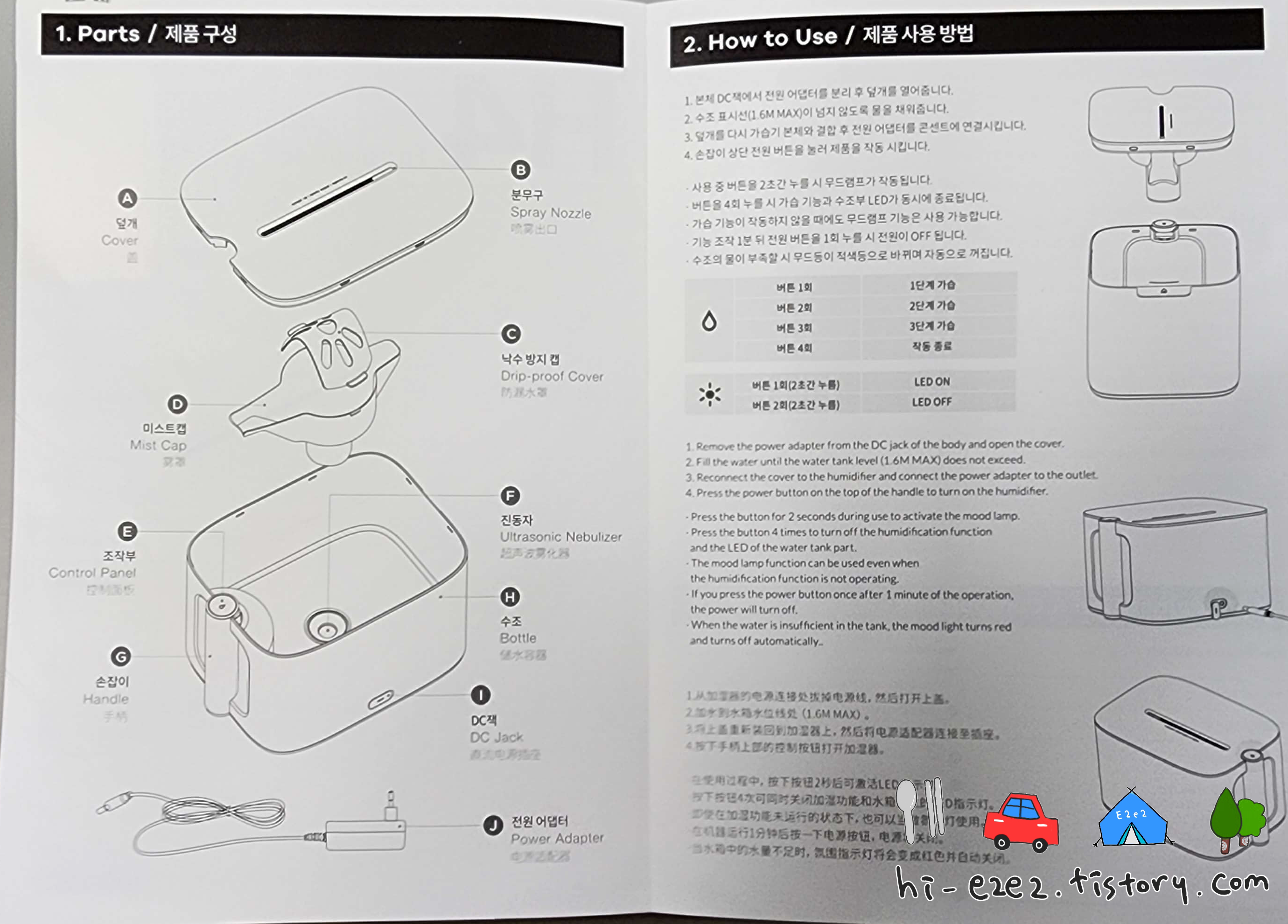 구성품과 조립순서도 나와있고 버튼 횟수에 따른 분사량 조절과 라이트조절방법도 나옵니다.