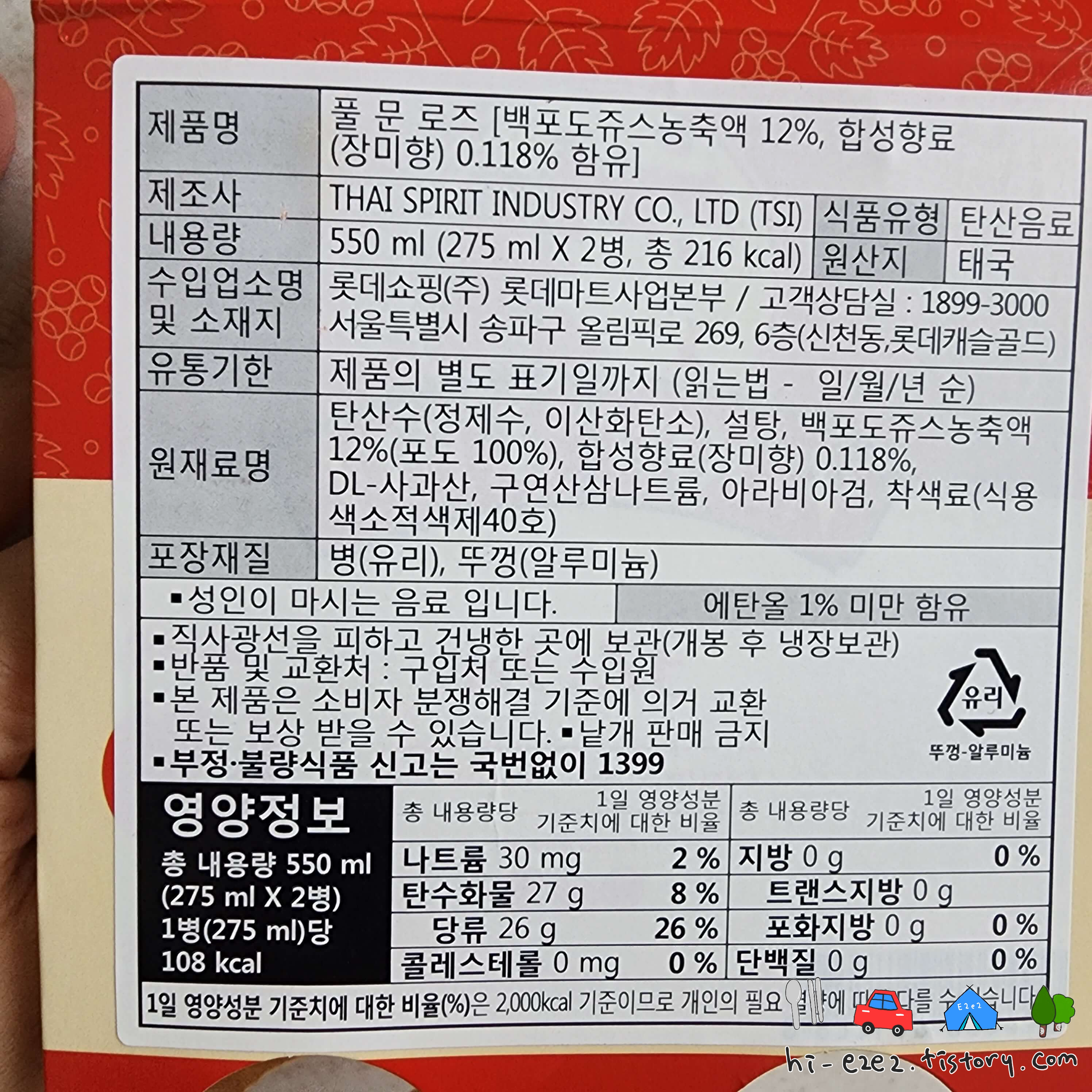 맛이 레드, 로즈 이런식이길래 당연히 알콜이 들었겠거니 했는데 에탄올 1%미만 함유..