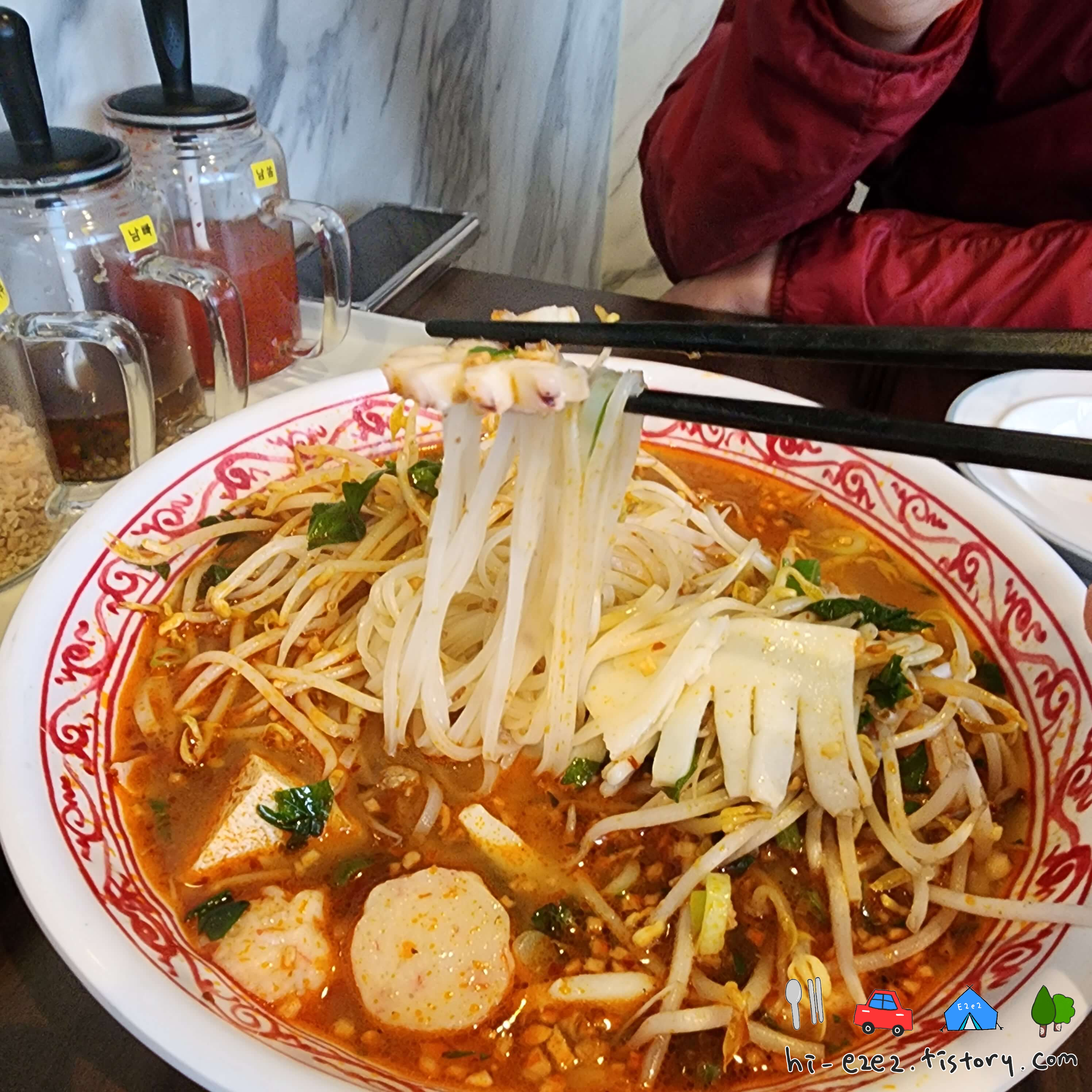 어묵볼과 두부, 오징어, 새우, 바지락, 숙주 등 토핑이 정말 한가득 들어있던 똠양꿍쌀국수!