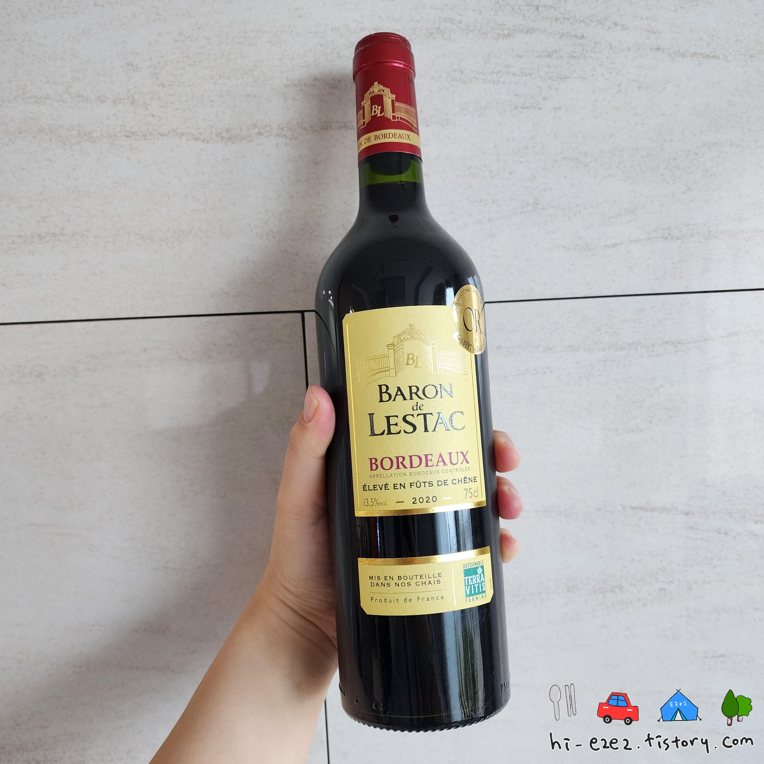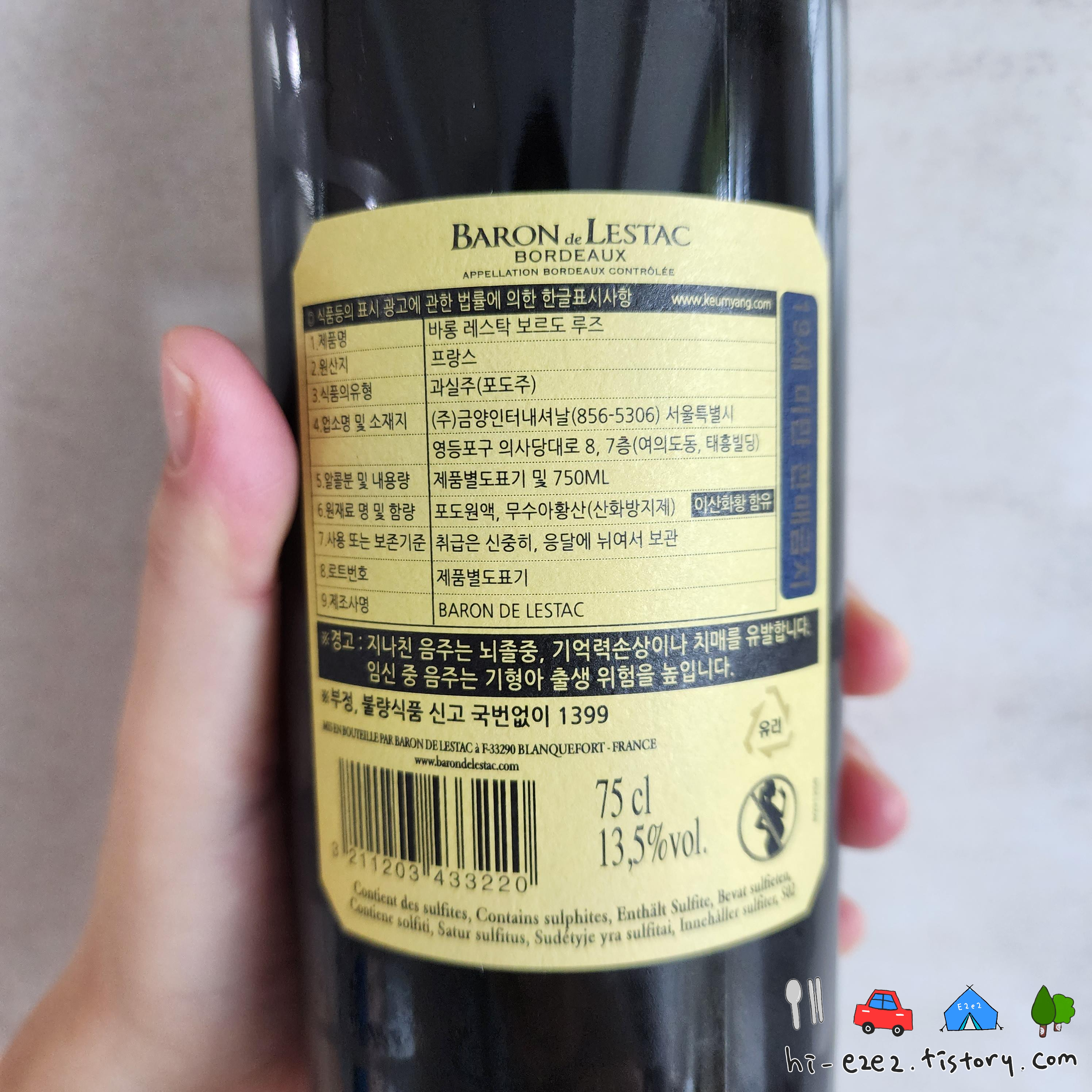 바롱 드 레스탁 보르도 루즈 2020은 750ml에 도수 13.5%랍니다.