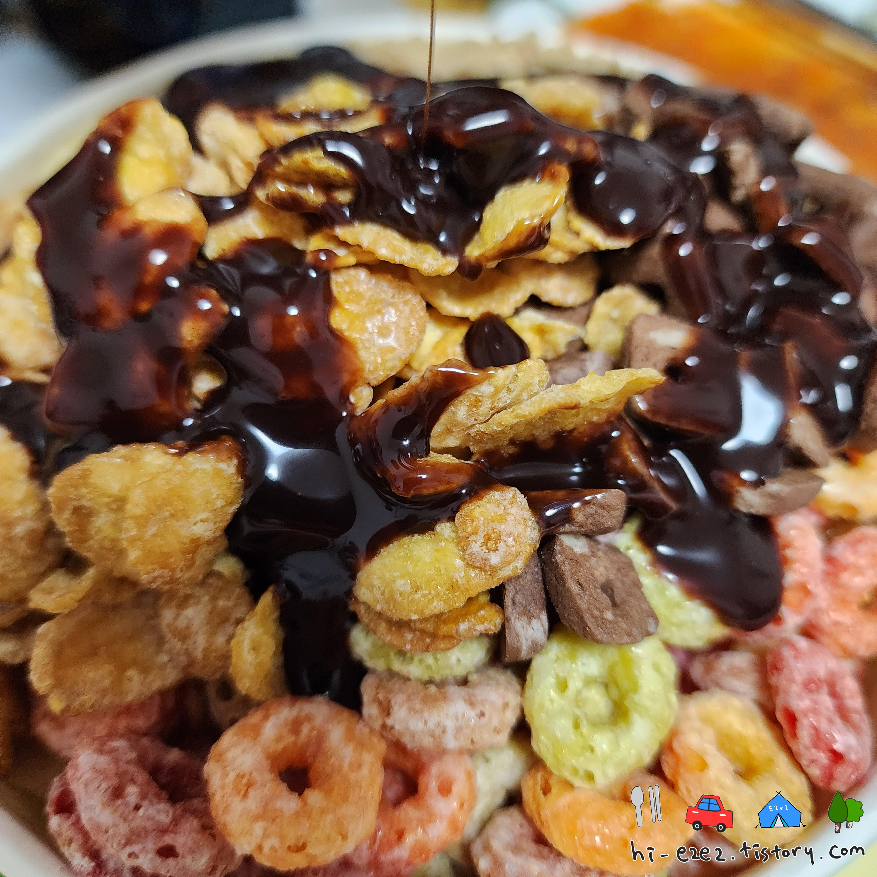 요아정의 입짧은햇님 조합은 바나나+벌집꿀+후르트링+그래놀라+콘푸라이트+초코시럽이예요ㅎㅎ