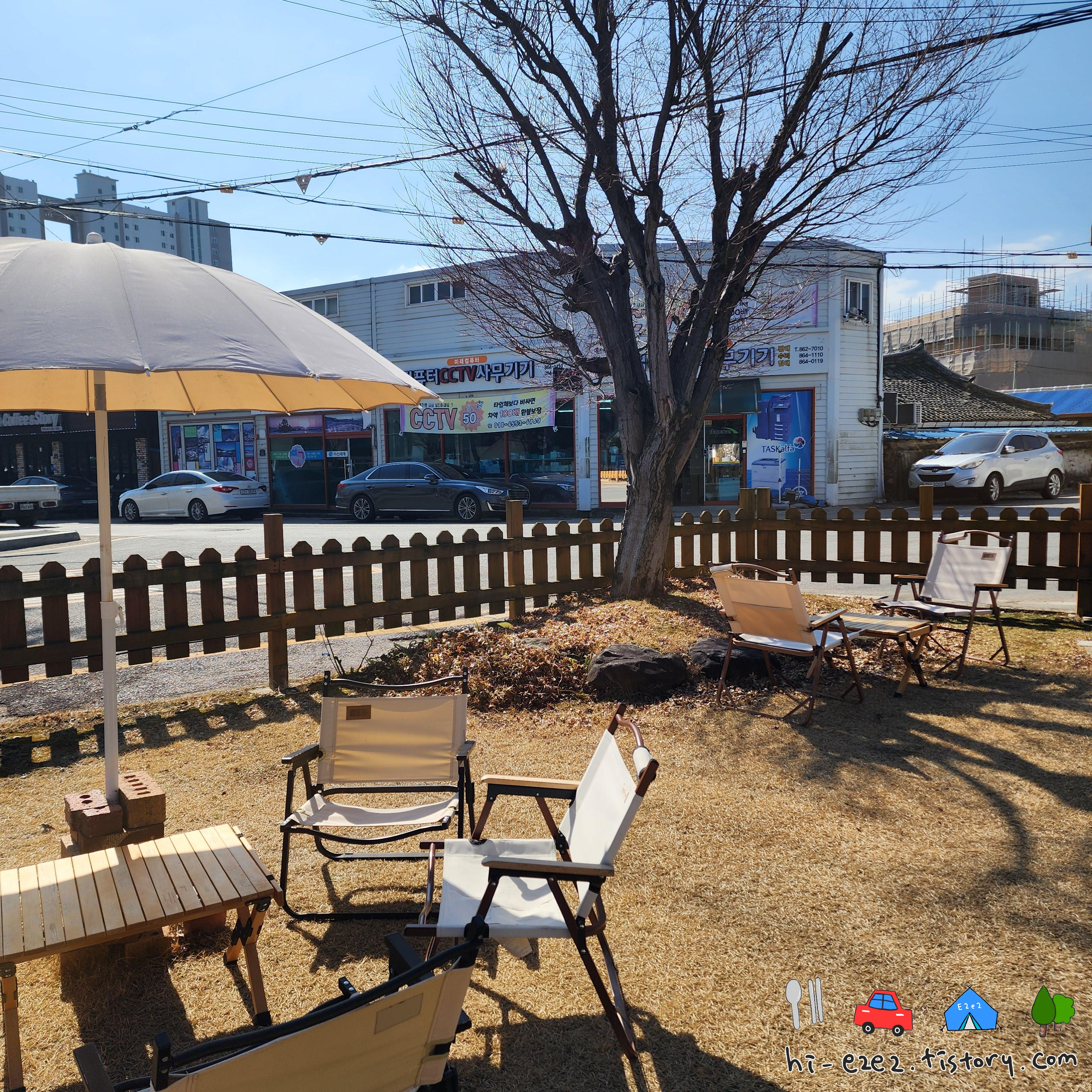앞에 작은 잔디밭에는 파라솔과 캠핑의자를 놔둬서 앉을 수 있더라고요~