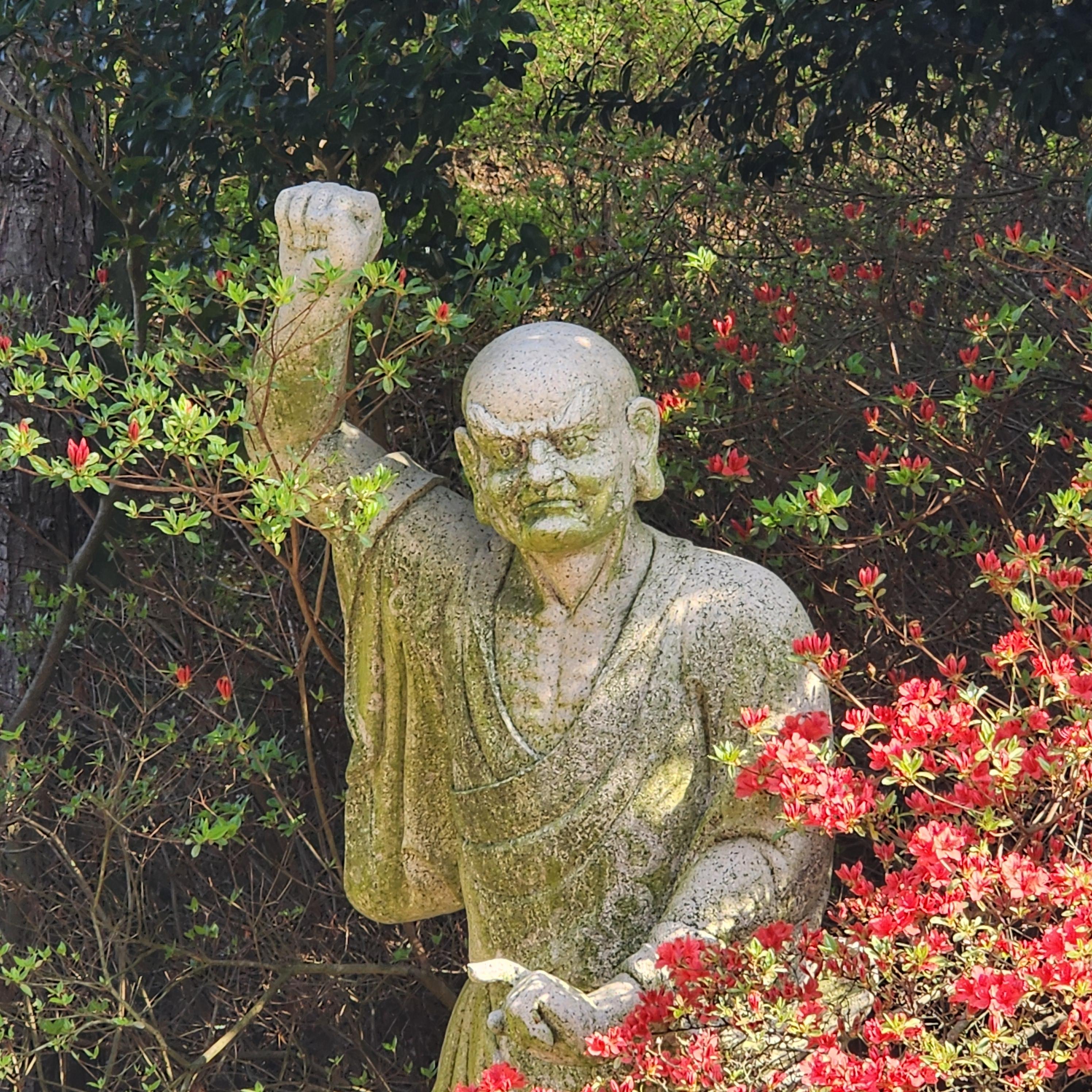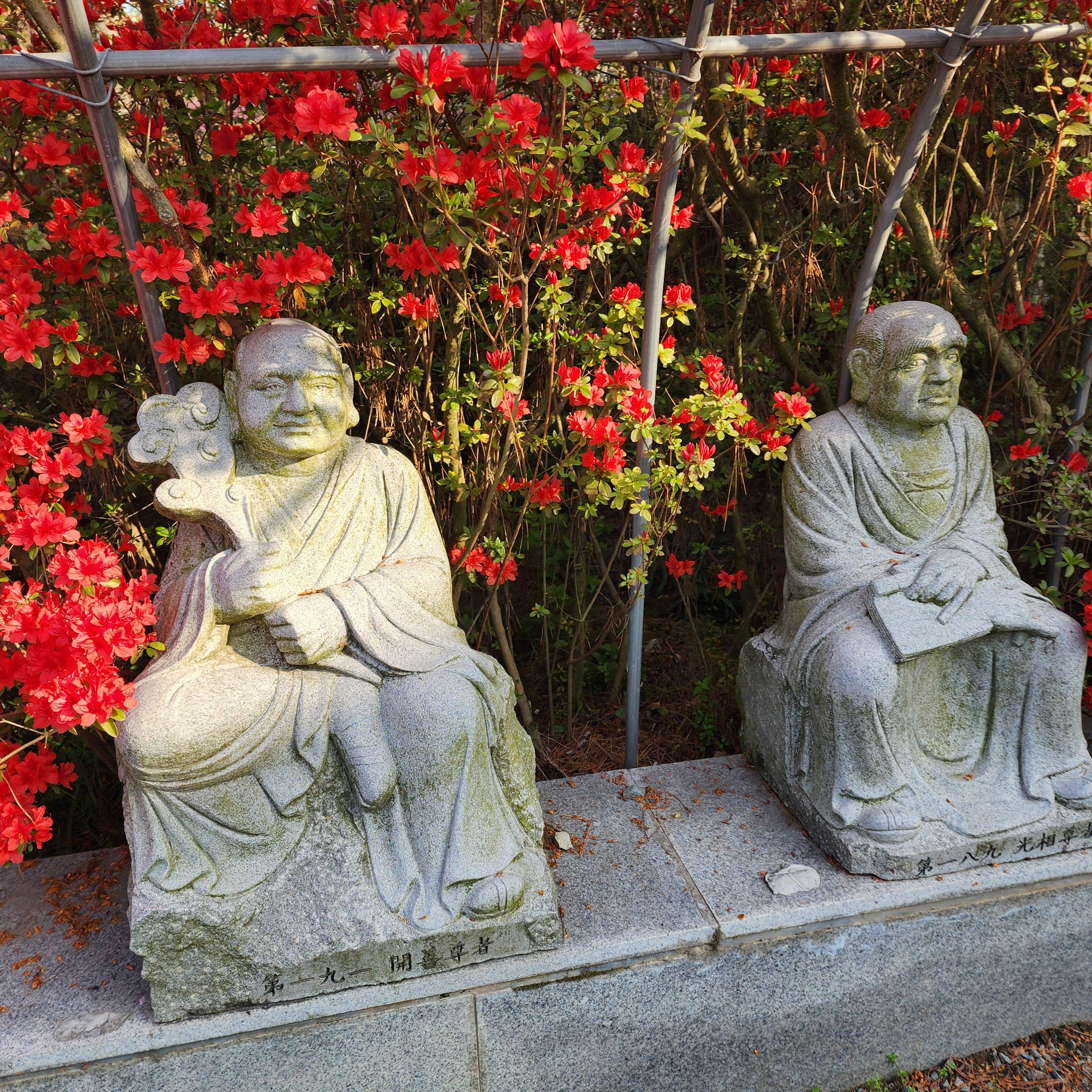 서부해당화 꽃 사이로 보이는 불상과 33관음전 지붕ㅎㅎ