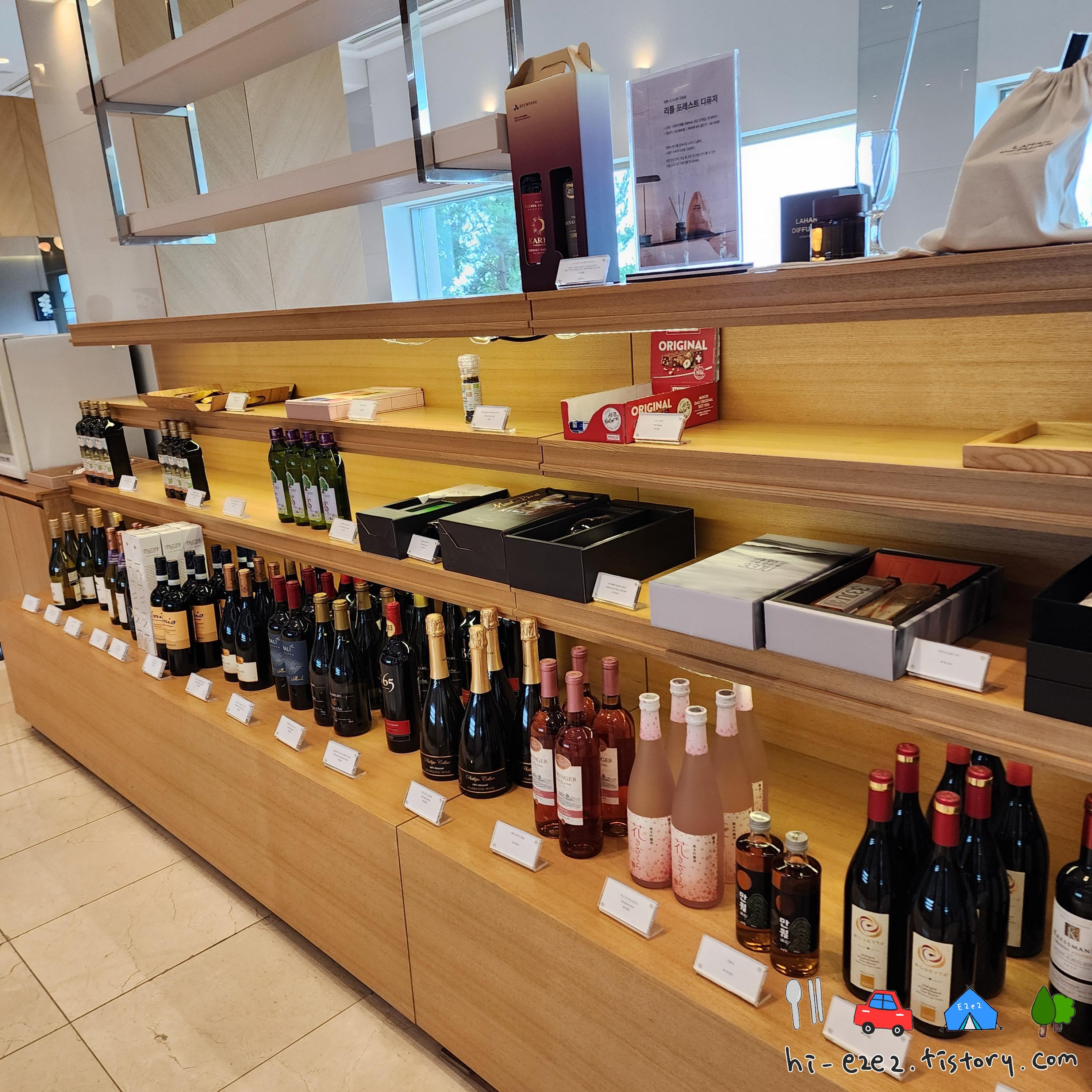 입구에 있는 와인, 빵, 케익들~
