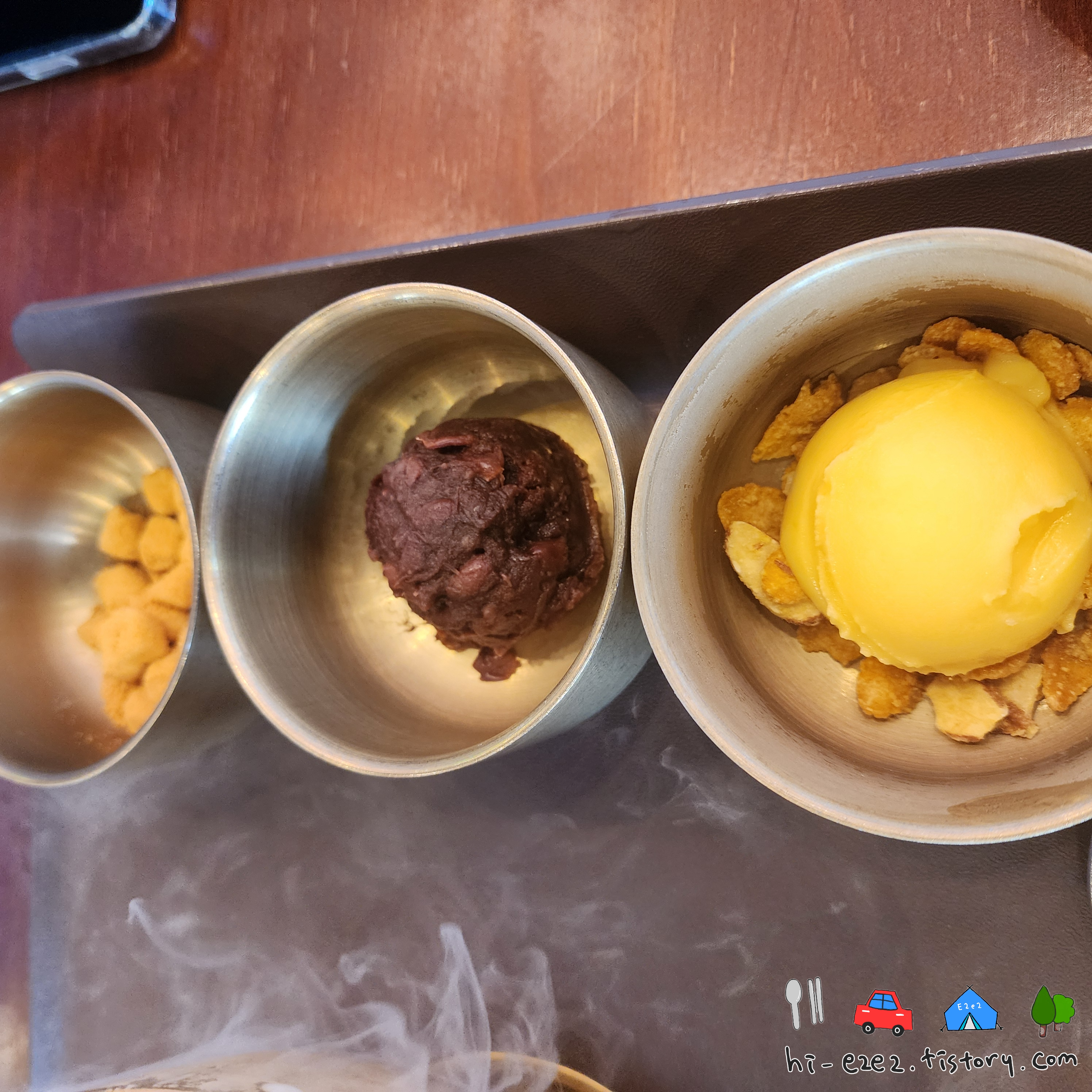 빙수에 같이 먹으라고 나오는 인절미떡, 팥고물, 망고샤베트!