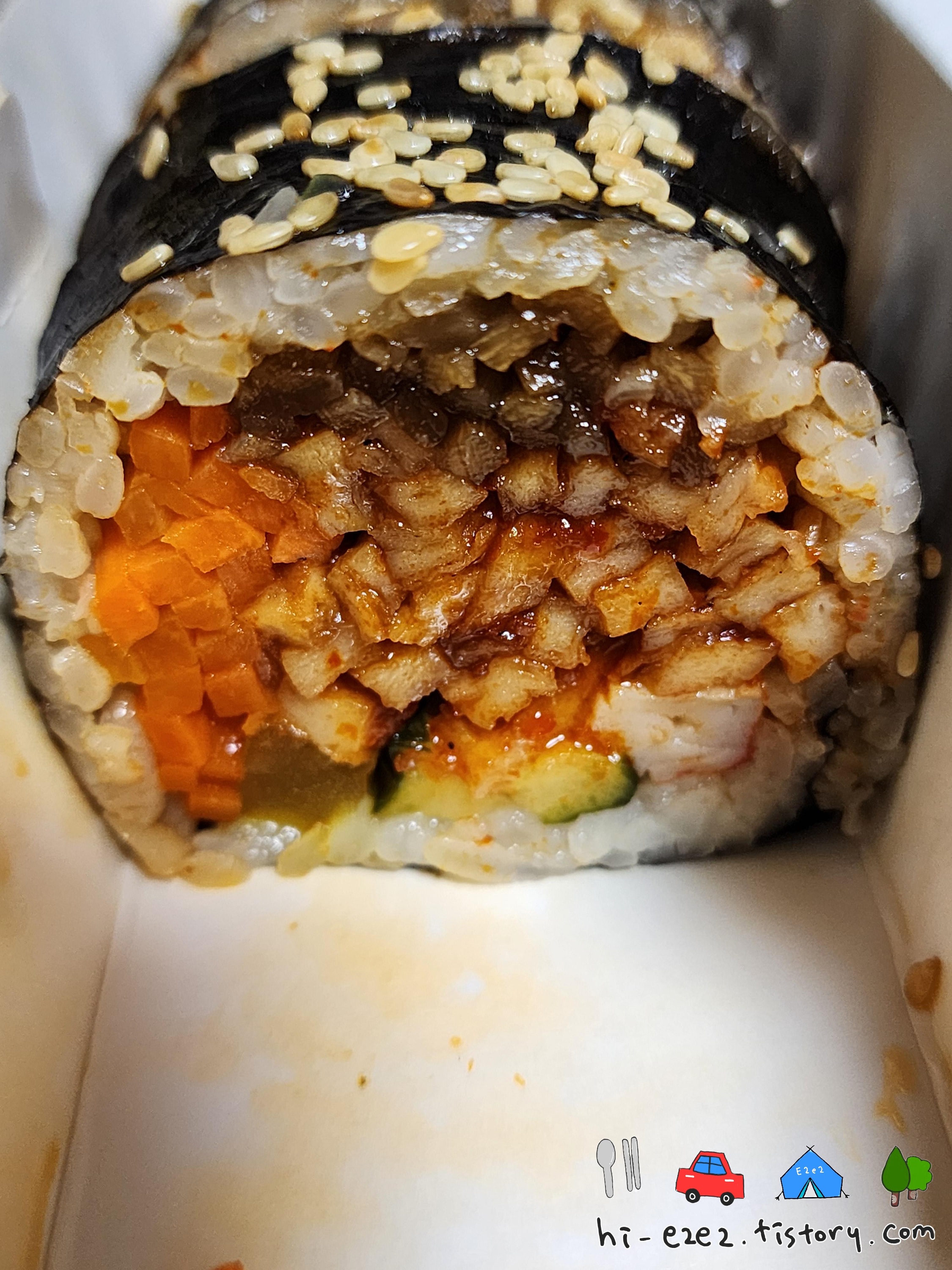 여기도 우엉유부, 당근, 단무지, 오이, 맛살이 들어가 있고 매운어묵이 1/3정도 들어간 모습!