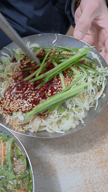 부산 여행 중 가볍게 먹기 좋은 비빔칼국수였어요.